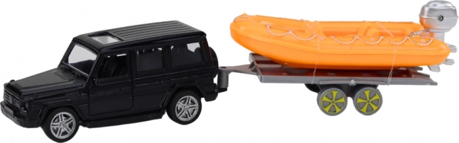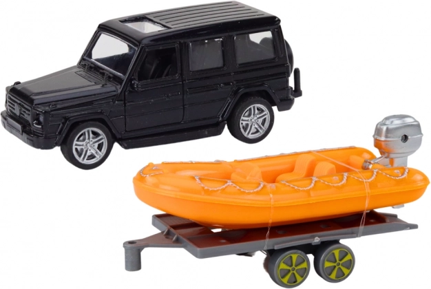 Wir präsentieren das neue Spielset, das jedes Kind garantiert beeindrucken wird - schwarzes Geländewagen mit Anhänger zum Transport eines orangefarbenen Boots! Die perfekte Kombination aus Land- und Wasserabenteuer, ideal für kleine Entdecker.