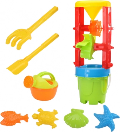 Dieses farbenfrohe Sandset fördert Fantasie und Feinmotorik. Das Highlight ist das große Mühlrad mit zwei drehenden Rädern, das Kinder zum Experimentieren mit dem Sandfluss anregt. Das integrierte Sieb dient zum Durchsieben des Sands und zum Trennen von kleinen Steinen, während der Trichter präzises Schütten erleichtert.