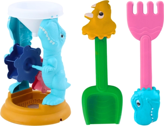 Dieses farbenfrohe Dinosaurier-Sandset macht jeden Nachmittag am Strand oder im Sandkasten zu einem Abenteuer. Kinder lieben die Sandmühle mit Dinosauriermotiv, durch die sie Sand sieben oder Wasser gießen können und dabei beobachten, wie sich die Schaufeln drehen. Die Förmchen helfen, originelle Bauwerke und Dinosaurierspuren zu gestalten und zugleich die Feinmotorik und Fantasie zu fördern.