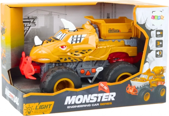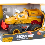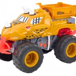 Das Auto ist als Dinosaurier mit Zähnen und Hörnern gestaltet und zieht so die Aufmerksamkeit jedes Kindes auf sich.