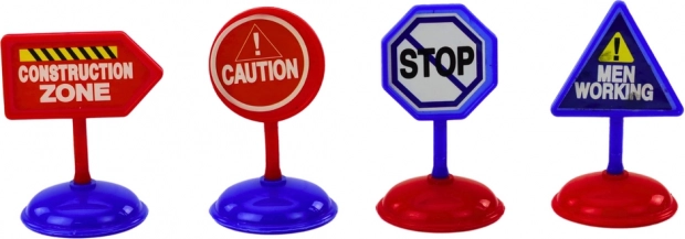 Das Set beinhaltet 4 bildende Verkehrsschilder, die eine Baustellenumgebung simulieren und Verkehrssicherheit lehren.