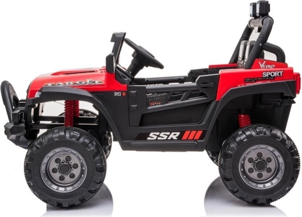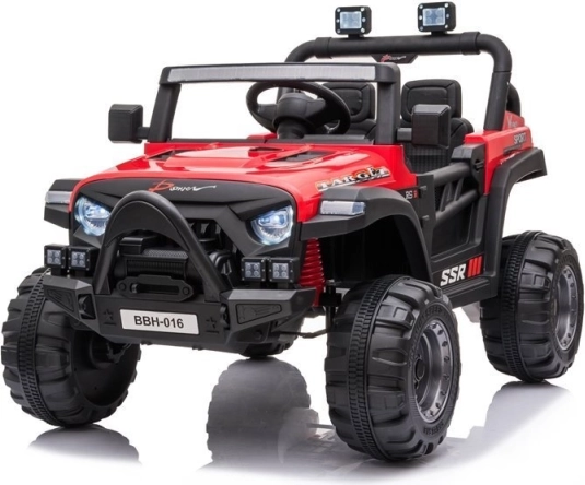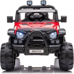 Das rote batteriebetriebene Auto mit sportlich-geländegängigem Design ist ideal für abenteuerliche Fahrten. Die robuste Konstruktion, der markante vordere Stoßfänger und realistische Details vermitteln ein authentisches Fahrerlebnis. Große Räder mit tiefem Profil meistern Unebenheiten, und die Frontscheinwerfer verleihen dem Spiel zusätzliche Realitätsnähe.