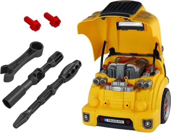 Die öffnende Motorhaube und abschraubbare Räder ermöglichen Kindern einen Blick ins Innere des Fahrzeugs und trainieren Montage und Demontage mit den beiliegenden Werkzeugen.