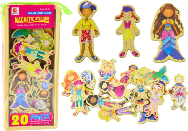 Holzmagnetische Figuren sind ein außergewöhnliches Set mit 20 unterschiedlichen Figuren in bunten Kostümen. Jede Figur hat ihre eigene Identität und ihr eigenes Design, was Kindern ein praxisnahes Spiel ermöglicht und ihre Erzählfähigkeiten fördert.