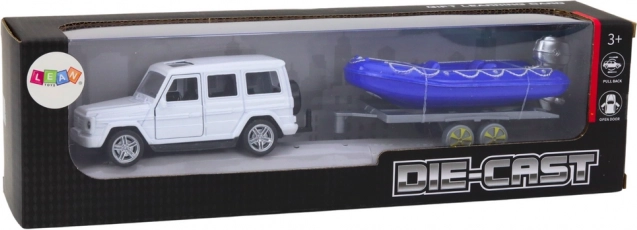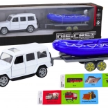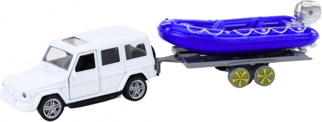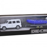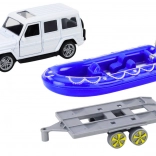 Erleben Sie aufregende Abenteuer mit dem Geländewagen und dem blauen Motorboot! Dieses Metallmodell bietet präzise Details, einschließlich öffnbarer Türen, in die Kinder Fahrer- und Passagierfiguren setzen können.