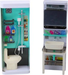 Dieses durchdachte Set besteht aus 4 verbundenen Segmenten: Duschkabine mit Toilette, Waschbecken mit Spiegel, Waschmaschine mit Schrank sowie Regale mit Bügelbrett. Das türkis-weiße Design und die präzise Verarbeitung fördern die Fantasie und motivieren Kinder, alltägliche Tätigkeiten nachzuahmen. Die Abmessungen des Sets 35 × 26 × 8 cm passen hervorragend ins Kinderzimmer und zu Puppenhäusern.