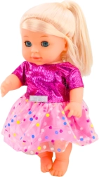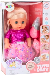 Diese bezaubernde Puppe mit blondem Haar und blauen Augen ist ideal, um die Babypflege nachzuahmen. Dank beweglicher Arme, Beine und Kopf kann sie leicht gesetzt oder gelegt werden, und die realistische Pipi-Funktion nach dem Trinken aus dem Fläschchen verleiht dem Spiel Authentizität.