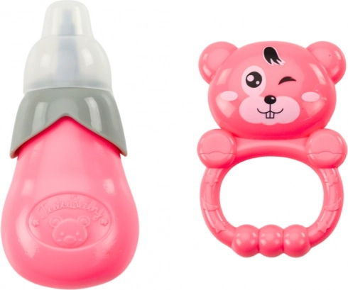 Zum Set gehört eine Babyflasche, die nach dem Befüllen mit Wasser dem "Pipi machen" der Puppe ermöglicht. Die Rassel fördert motorische Entwicklung und Koordination.