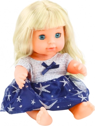 Elegante Puppe im Matrosenkleid mit langen blonden Haaren, die zum Frisieren und Stylen in verschiedene Frisuren geeignet sind. Ihre Realitätsnähe wird durch bewegliche Gliedmaßen und schließende Augen unterstützt, die ein schlafendes Baby simulieren.