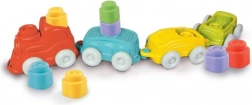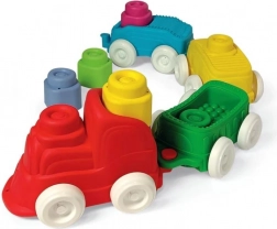 Die weichen, bunten Bausteine können in die Lokomotive und die Waggons gesteckt oder aufeinander gesetzt werden, um weiche, farbenfrohe Türme zu bauen.