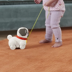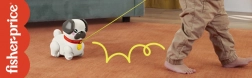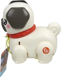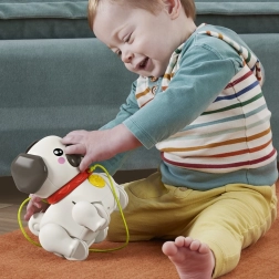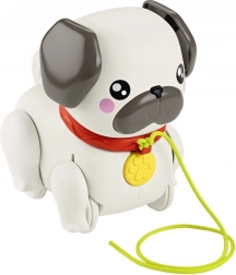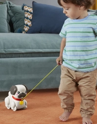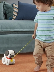 Lernen Sie den ziehbaren Mops kennen, der jeden Schritt Ihres Kindes in ein spannendes Abenteuer verwandelt. Einfach die Leine in die Hand nehmen und der Hund „läuft los“ – Ohren und Pfoten bewegen sich rhythmisch und es ertönt ein freundliches Bellen. Die ideale Spielzeugwahl für Kinder ab 12 Monaten, die das Laufen und die Welt um sich herum entdecken.