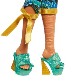 Cleo De Nile ist bereit für das heißeste Musik-Event des Jahres – das Monster Fest! Sie besticht mit einem Top mit goldenen Ärmeln, Hosen in Edelsteinfarben und einer Krone mit Lotusmotiv, die ihr langes blaues Haar betont. Dank der Gelenke lassen sich coole Posen für Fotos und Rollenspiel im Handumdrehen einstellen.