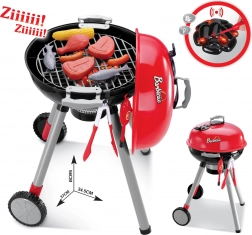 Das Set enthält alles, was man für ein Familien-BBQ braucht: Schlitze im Grillrost, eine große Auswahl an Plastiklebensmitteln (Würstchen, Steaks, Hähnchen, Fische, Mais, Aubergine), Zubehör, Teller, Becher und sogar eine Pfeffermühle. Der abnehmbare Deckel schützt den Rost nach dem „Grillen“ und dank der Räder und des Griffs lässt sich der Grill leicht auf die Terrasse oder ins Kinderzimmer bewegen.