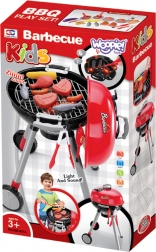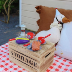 Würstchen, Steaks, Hähnchen, Fische, Mais, Aubergine, Teller, Besteck, Becher, Pfeffermühle, Zange und ein Feuerzeug – alles in einem Set für stundenlangen Spielspaß.