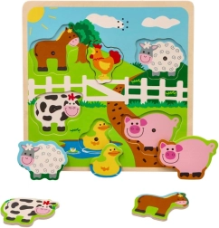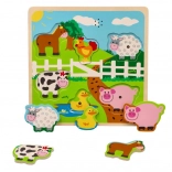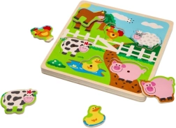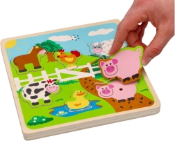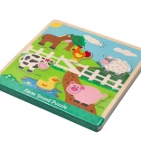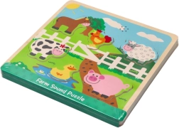 Das Holz-Soundpuzzle mit Bauernhofmotiv ermöglicht Kindern erste Entdeckungen von Formen, Farben und Klängen. Jedes Teil stellt ein bekanntes Nutztier dar und beim Einsetzen an die richtige Stelle ertönt ein charakteristischer Laut, der natürliche Neugier und Konzentration fördert.