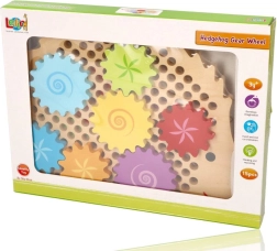 Das Platzieren der Zahnräder auf die Stifte trainiert Griff, Hand-Auge-Koordination und Geduld – ideal für Vorschulkinder.
