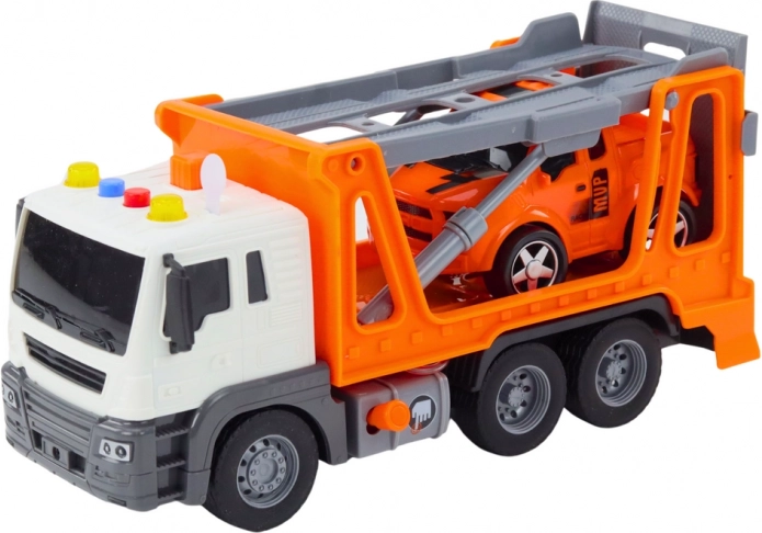 Das Set enthält ein weiteres Auto, das auf den Anhänger geladen werden kann,