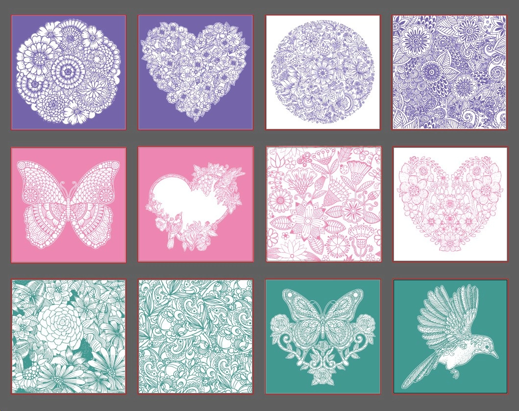 Das Set enthält 12 Ausmalbilder mit Tier- und Pflanzenmotiven. Die Bilder haben eine metallische Folie in Rosa, Violett und Grün. Papierstärke: 170 g. Zum Ausmalen können Buntstifte oder Filzstifte verwendet werden.