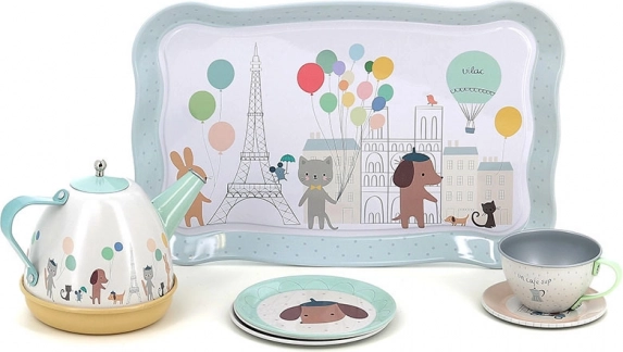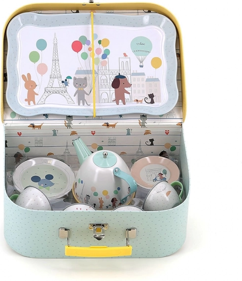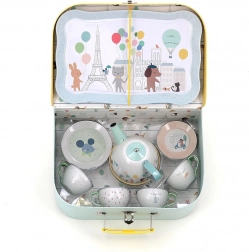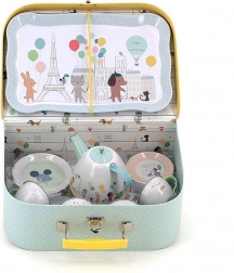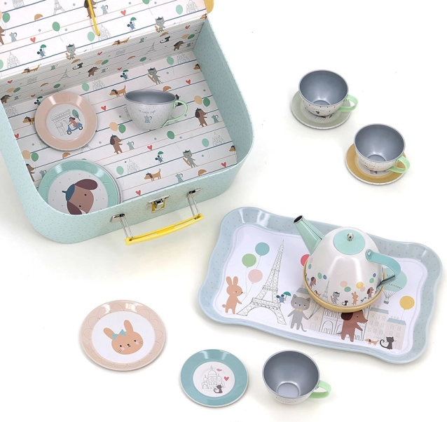 Dieses niedliche Set enthält 14 Teile, die von Sarah Betz illustriert sind und mit sanften Farben und Motiven ein Gefühl von Paris vermitteln. Das Set umfasst ein Tablett, eine Kanne und vier Tassen mit Untertassen, ideal für spielerische Teepartys. Dank des praktischen Koffers können Sie das Set einfach transportieren und auch unterwegs nutzen.