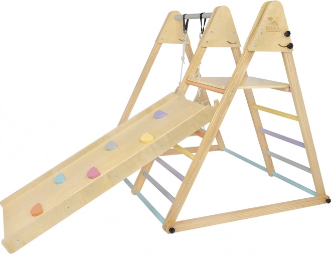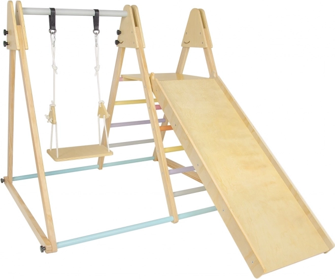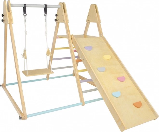 Die Montage ist erforderlich und eine detaillierte Anleitung in den Sprachen CZ, SK und EN liegt bei. Das Set ist mit einer Schaukel, einer Kletterwand und einer Rutsche mit pastellfarbenen Griffen für maximalen Spielspaß ausgestattet.