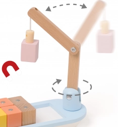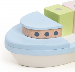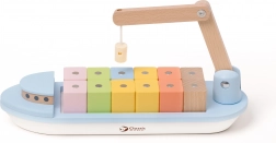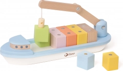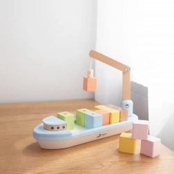 Dieses Holzfrachtschiff ist ein durchdachtes Spielzeug für Kinder ab 2 Jahren. Enthalten sind 12 magnetische Blöcke und ein stabiles Schiff mit beweglichem Kran, der das einfache Umsetzen der „Container“ ermöglicht. Dank glatter Formen und hochwertigem Holz ist das Spiel sicher und angenehm anzufassen.