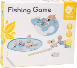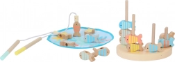 Zwei magnetische Angelruten und bunte Fische mit Metallösen trainieren Präzision und Hand-Auge-Koordination. Wer fängt die meisten Fische aus dem „Teich“?