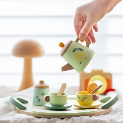 Schenken Sie Kindern ein magisches Tee-Ritual mit einem eleganten Holzset in sanften Pastelltönen. Das Set ist mit Obst- und Blumenmotiven verziert und enthält ein Kännchen, Tassen mit Untertassen, Löffel, eine Milch- und Zuckerdose sowie ein großes Tablett mit Griffen für einfaches Tragen.