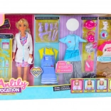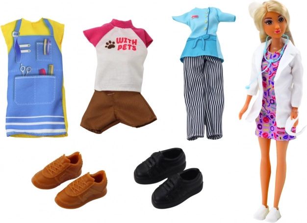 Im Set finden Sie mehrere Outfits und Schuhe, einschließlich Schürze und Freizeitkleidung – schnelle Verwandlung zur Friseurin, Köchin oder Tierpflegerin.
