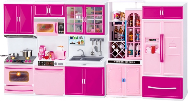 Das Puppen-Küchenmöbel-Set umfasst einen Kühlschrank, ein Spülbecken, eine Mikrowelle, eine Spülmaschine, einen Herd und Stauschränke. Jedes dieser Elemente wurde sorgfältig entworfen, um echte Küchenmöbel nachzubilden. Schränke und Geräte sind mit zu öffnenden Türen ausgestattet, sodass die beiliegenden Lebensmittel und Küchenaccessoires bequem eingelegt und herausgenommen werden können.