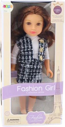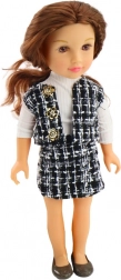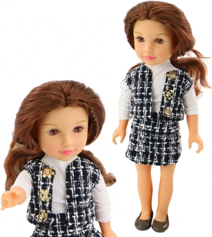 Die Puppe besticht durch ihr elegantes Outfit bestehend aus einem schwarz-weißen karierten Rock und einer Weste, die zusammen einen einzigartigen Stil schaffen. Ein weißes Langarmhemd ergänzt das Gesamtbild und verleiht einen klassischen Touch.