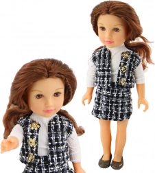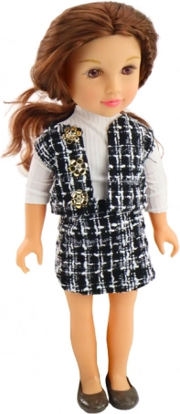 Die Puppe trägt ein modernes kariertes Outfit, das Weste und Rock mit weißem Hemd und schwarzen Schuhen kombiniert.