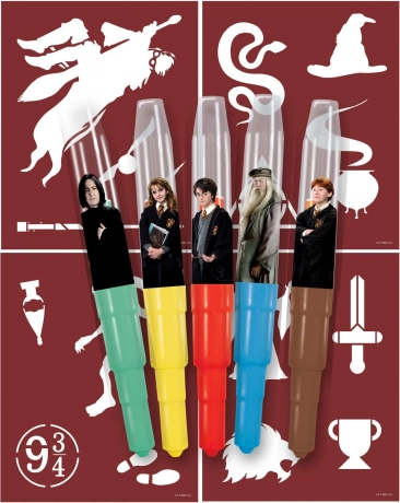Gestalte deine eigenen magischen Bilder mit Blas-Filzstiften, inspiriert von der Welt von Harry Potter. Das Set enthält 6 farbige Blas-Filzstifte und Schablonen mit ikonischen Motiven – Hogwarts-Häuser, die Heiligtümer des Todes, der Goldene Schnatz oder die Brille mit Narbe. Einfach den Stift in den Halter stecken, pusten und im Handumdrehen einen Sprayeffekt zaubern.