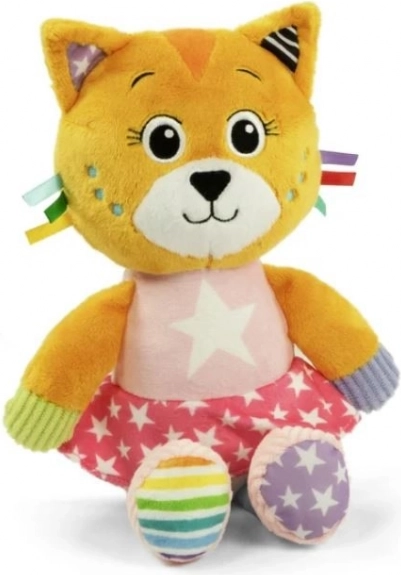 Die Plüschkatze besticht durch ihr farbenfrohes Aussehen mit verschiedenen Texturen, die die sensorische Wahrnehmung der Kinder stimulieren.