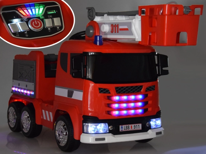 Das Multifunktionspanel ermöglicht Musikwiedergabe, USB/MP3, das Umschalten der Lichtmodi (dauerhaft/blinken/aus) sowie die Aktivierung des Schaukelmodus (das Auto bewegt sich selbstständig vor/zurück). Die 2,4 GHz Fernbedienung mit Elternkontrolle erhöht die Sicherheit – sie steuert Richtung, 3 Geschwindigkeiten und die P-Stop-Taste. Ihr Kind freut sich über Hupe, Musik, Rückfahrton sowie die Hebelsteuerung der Leiter (hoch/runter) und das Auslösen der Spritze per Knopf.