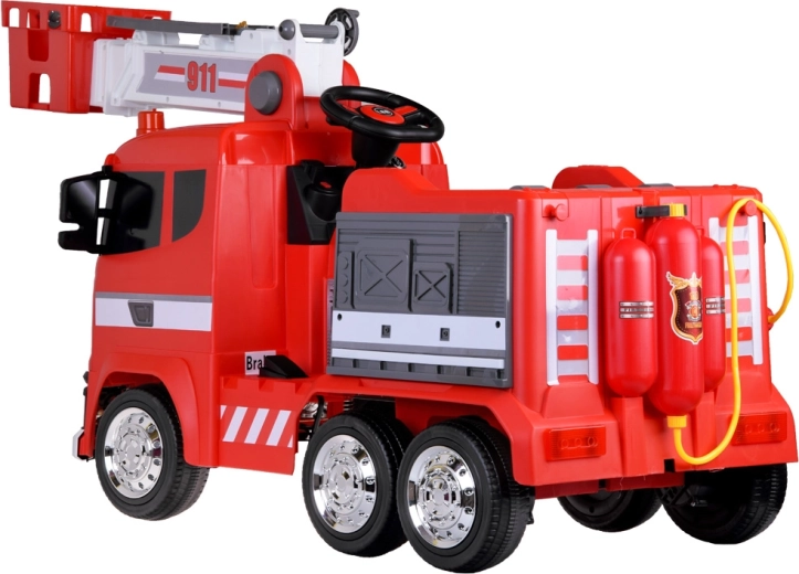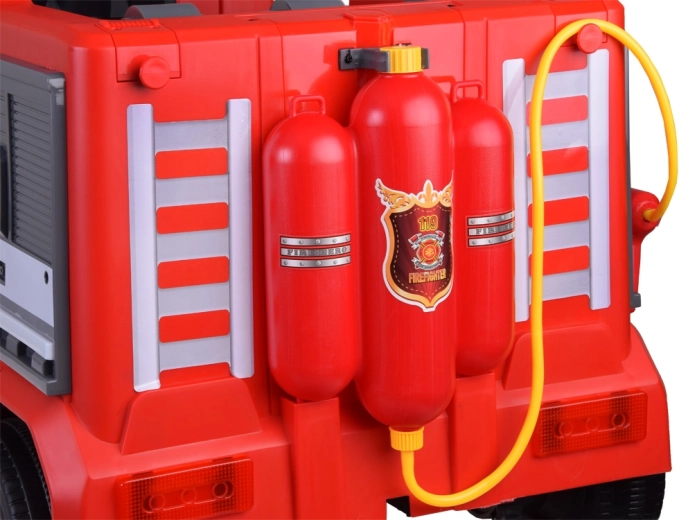 Einsatz wie bei echten Feuerwehrleuten: Steuern Sie die Leiter per Hebel nach oben/unten und aktivieren Sie die Spritze per Knopf. Der hintere Wassertank mit Gurten liefert Wasser für lange Einsätze.