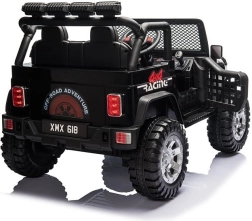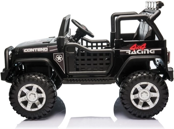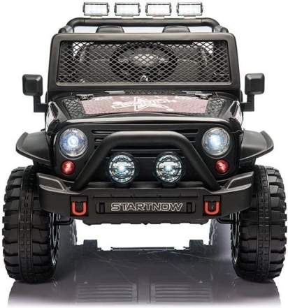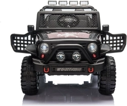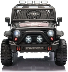 Entdecken Sie ein modernes elektrisches Kinderauto mit attraktivem Offroad-Look und markanten Elementen wie massiven Reifen, vorderem Schutzstoßfänger und Lichtleiste. Die schwarze Ausführung wirkt elegant und zugleich sportlich – ein Hingucker auf den ersten Blick.