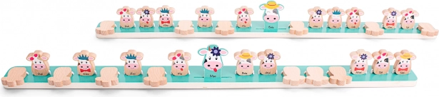 Ein logisches, leicht detektivisches Spiel für 2 Spieler ab 6 Jahren. Jeder Spieler wählt eine Karte mit einem Kuhbild und stellt sie auf seinen Ständer, sodass sie für den anderen Spieler verborgen bleibt. Anschließend stellen beide Spieler abwechselnd Fragen, um herauszufinden, welche Kuh der andere Spieler hat. Trägt deine Kuh einen Hut? Oder vielleicht eine Schleife? Wenn nicht, drehe sie um. Die letzte verbleibende Kuh ist die richtige. Gewinnt, wer als Erster die Kuh des Gegenspielers richtig errät. Das Spiel fördert Aufmerksamkeit und logisches Denken. Inhalt: 2 Ständer mit Kühen (56 x 4 x 4,5 cm) | 16 Karten mit Kuhbildern. Das Spiel fördert: lösungsorientiertes logisches Denken, vorausschauendes Denken.