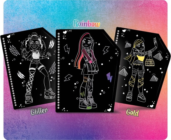 Entdecke eine unterhaltsame Art zu zeichnen und zu dekorieren mit dem Monster High Kratzer-Skizzenbuch. Es reicht, die schwarze Oberfläche leicht abzukratzen, um erstaunliche Farbeffekte zu enthüllen, die deinen Werken einen einzigartigen Stil verleihen.