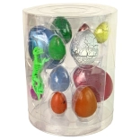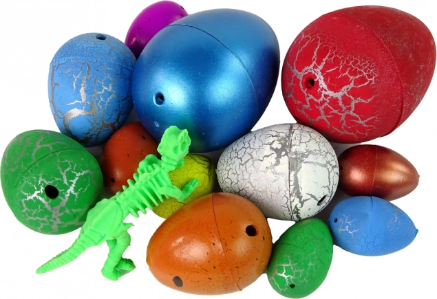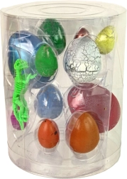 In der Packung finden Sie 12 Stück Eier in verschiedenen Farben, Mustern und Größen (von ca. 3 × 2 cm bis 6 × 4,5 cm) sowie zusätzlich ein grünes Dinosaurier-„Skelett“ mit 6 cm Länge. Alles ist in einer praktischen Plastikröhre und Geschenkverpackung untergebracht.