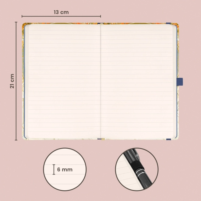 Elegantes liniertes Notizbuch mit dem Motiv Alfons Mucha – Musik in festem Einband bietet praktischen Gummibandverschluss, Stiftschlaufe und eine innere Tasche für Kleinigkeiten. Innen finden Sie 172 Seiten auf angenehmem gelbem Papier, ideal für Tagebuch, Arbeitsnotizen und das Festhalten von Ideen.