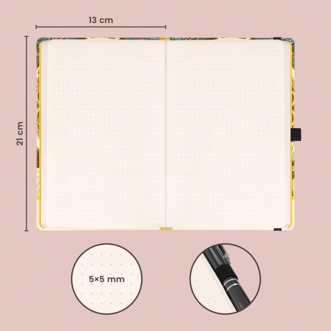 Das stilvolle Notizbuch mit dem ikonischen Motiv Alfons Mucha – Feder ist ein praktischer Begleiter für tägliches Schreiben und kreative Arbeit. Der feste Einband schützt den Inhalt, das gepunktete Papier erleichtert das Zeichnen von Schemata, Skizzen und übersichtlichen Notizen.