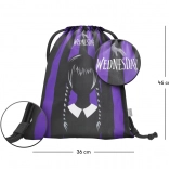 Leichter und praktischer Rückenbeutel mit ikonischem Wednesday-Motiv – die perfekte Ergänzung für jedes Freizeitoutfit. Dank des strapazierfähigen, pflegeleichten Materials eignet er sich für den täglichen Gebrauch – für die Schule, die Turnhalle und Ausflüge.