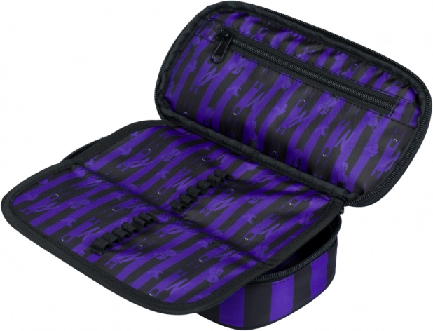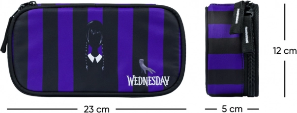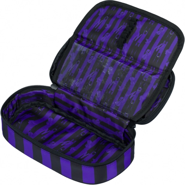 Das strapazierfähige Design in schwarz‑violetten Streifen mit ikonischem Wednesday-Schriftzug sorgt für lange Lebensdauer und einen markanten Look für die Schule.