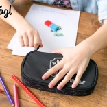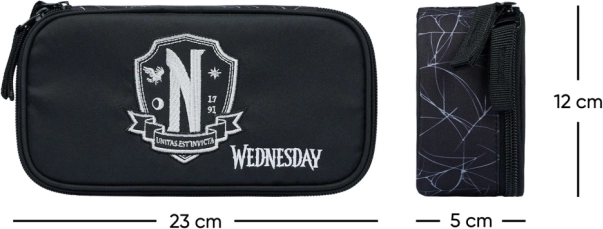 Das schwarze Etui mit Emblem und dem Schriftzug Wednesday besticht durch sein originelles Erscheinungsbild und sorgfältige Details, die Ihren Stil in der Schule und unterwegs unterstreichen.
