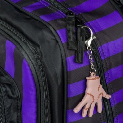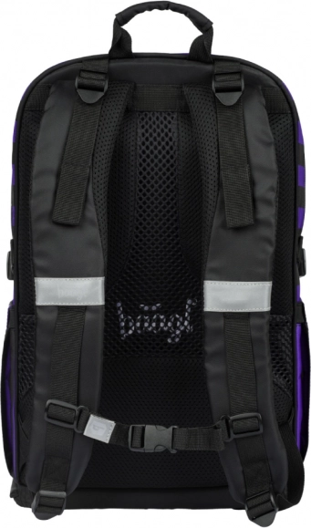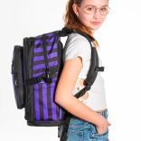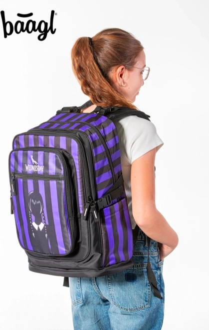 Das Cubic-Wednesday-Set enthält einen stilvollen Rucksack, ein praktisches Federmäppchen und einen Schuhbeutel – alles im modernen Design mit schwarzen und violetten Streifen. Der Rucksack ist ergonomisch gestaltet, während Mäppchen und Beutel für Ordnung bei Schulbedarf und Freizeitaktivitäten sorgen.