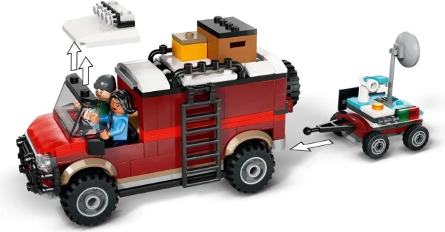 Der Offroad-Wagen bietet Platz für zwei Minifiguren, hat ein abnehmbares Dach, ein zu öffnendes Heck und clevere Staufächer. Der Anhänger verfügt über eine drehbare Satellitenschüssel, ein Mikroskop und Bildschirme.
