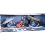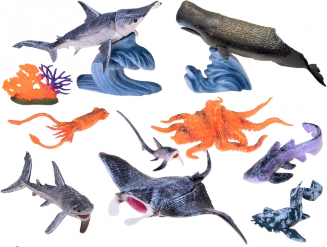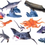 Im Set enthalten sind Manta, Pottwal, Hammerhai, Oktopus, Kalmar, mehrere Haiarten, ein Korallendekor sowie zwei Wellen zum Gestalten von Szenen.