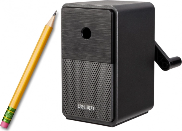Eleganter manueller Kurbelspitzer in Schwarz mit stufenloser Spitzenregulierung, großem Auffangbehälter und komfortabler Handhabung für Zuhause, Schule und Büro. Die stabile Konstruktion und die präzise Einstellung der Spitzenlänge sorgen stets für perfekt gespitzte Blei- oder Buntstifte.