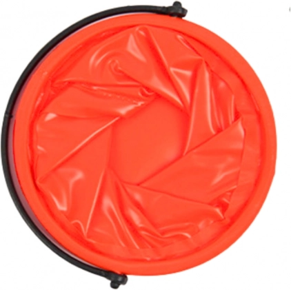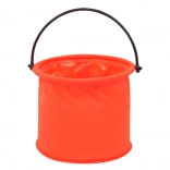 Der orangefarbene Falt-Eimer kann leicht zu einer flachen Form zusammengelegt werden, was das Lagern und Transportieren erleichtert.