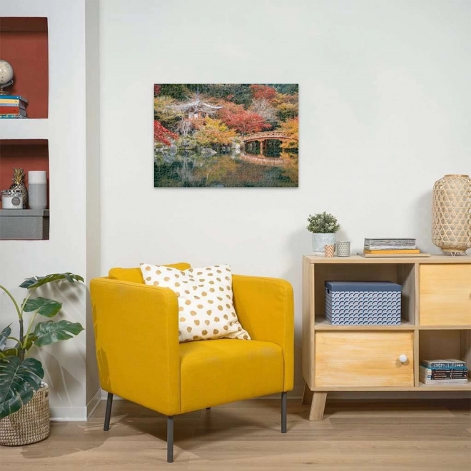 Die herbstliche Palette aus Rot- und Orangetönen mit traditioneller Brücke und Tempel schafft ein Motiv, das sich mit Freude legen lässt und beruhigend wirkt.